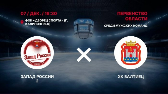 7 декабря 2025 г. в 16:30 в физкультурно-оздоровительном комплексе «Дворец спорта» (г. Калининград) состоится матч Чемпионата Калининградской области по хоккею среди мужских команд в сезоне 2025/2026 между командами Запад России 2 и Балтиец.